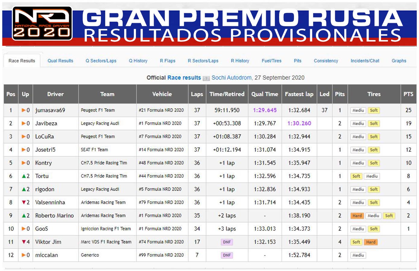 Jumasava69 ha conseguido una cómoda victoria en el GP de Rusia Formula NRD 2020. Entre los dos Peugeot terminó un gran Javibeza, que nada pudo hacer para poner en peligro la victoria del piloto murciano. Locura, tercero con un accidente y muchísimos problemas. Ausencia importante y muy comentada por el padoock del equipo BH Lotus RedBull F1 que fue adelantado en el mundial de constructores por el equipo CH7.5 Pride Rasin Tim.