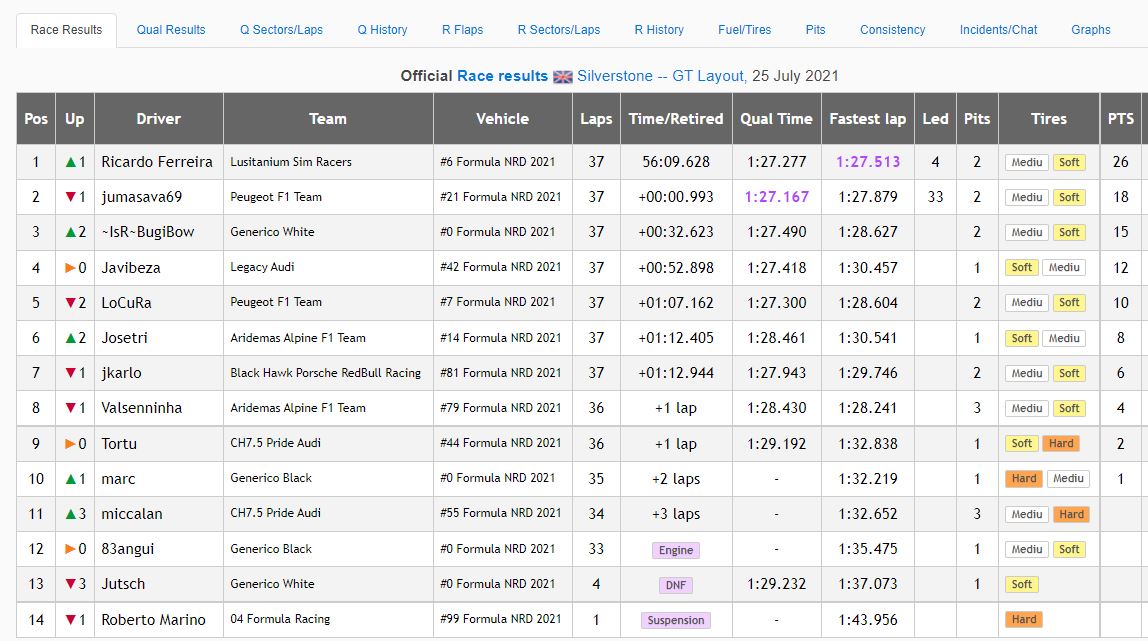 Hicimos una buena Q, eso nos garantizó un buen cajón en la salida. En la carrera los dos Peugeot salimos muy bien, colocándonos P1 y P2. Yo me notaba que no tenía el ritmo de la semana pasada por eso intente «ayudar» a mi compañero reteniendo a las dos bestias de Ricardo & Bugi. Tuve bonitas batallas y muy limpias con ellos dos. Me adelanto Ricardo y por detrás Bugi. A partir de aquí empecé a gestionar más la carrera y decidí lo que no tenía planeado ir a una parada. No salió como esperábamos…pero en este transcurso tuve buenas luchas con Javibeza que hicimos la misma estrategia. Felicitar a los chicos del podio y a todos los que finalizaron. Nos vemos en Hungría.