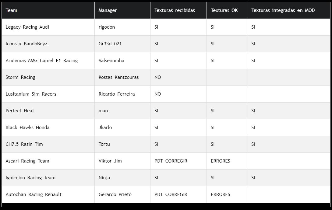 Este es el estado actual de lo que hemos recibido y podido integrar en el mod a día de hoy:
