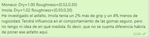 - Se ha investigado el origen del problema que tenían dichos pilotos (invirtiendo horas de tiempo libre, como siempre), por si existía algún problema en el mod o en el circuito, ya que se estaba indicando que las ruedas duraban menos que en Imola, cuando realmente son las mismas: