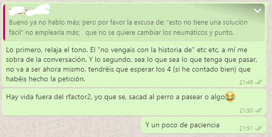 No se por qué interpretas que se te ha despreciado al responderte así, pero simplemente te estaban dando la información de que no a todo el mundo le duraban las ruedas tan poco como a tí, y quizá en vez de echar la culpa a causas externas, podías esforzarte más en revisar los valores que sí puedes cambiar (como el setup, conducción o estrategia). Tampoco dice en el reglamento que no se puedan cambiar las gomas, y como has visto todo este procedimiento puede hacerse perfectamente (como también dije yo en el grupo, que no era decisión solamente mía, pero por poder, se podía cambiar).